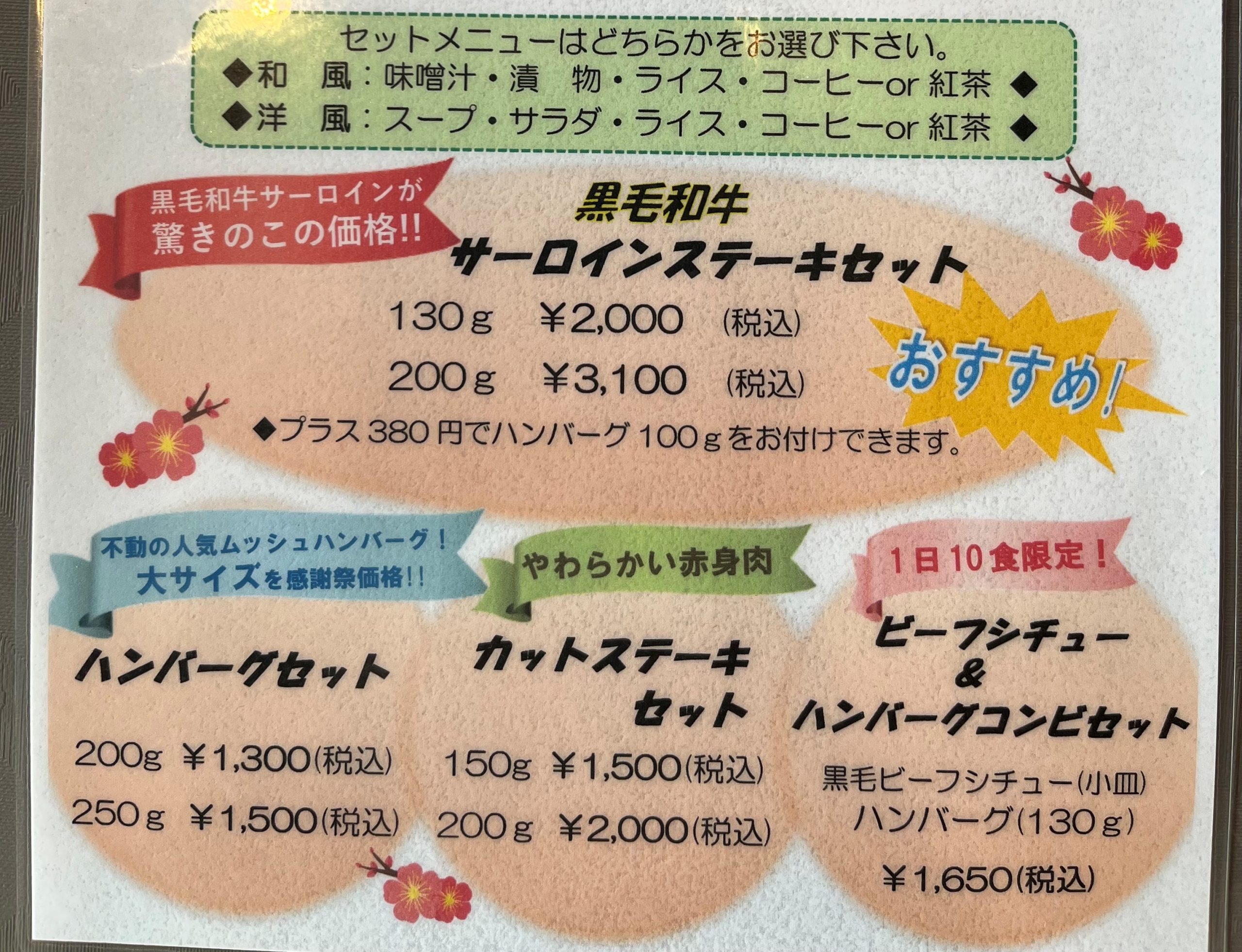 筑紫野店限定で2月1日~2月28日まで感謝祭が始まります☆黒毛和牛ステーキやハンバーグの大きいサイズ、感謝祭限定の赤身の柔らかいステーキ等お得なメニューがございます(#^^#) 全てライスなどのセット込みの価格です!ぜひこの機会にご賞味ください☆